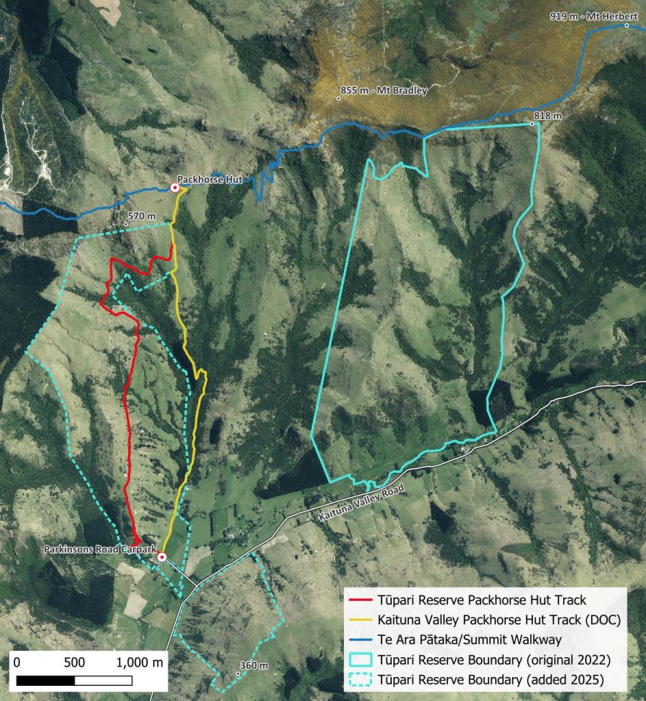 The northern boundary of Tūpari Reserve is along a ridge that lies between Mounts Bradley and Herbert/ Te Ahu Pātiki and is shared with the 500 hectare conservation block of Te Ahu Pātiki. Together with other neighbouring land to the east, there is approximately 2,000 hectares of contiguous land which is being managed for conservation. Regeneration within this larger block is more effective than islands of vegetation, which are each vulnerable at their edges.